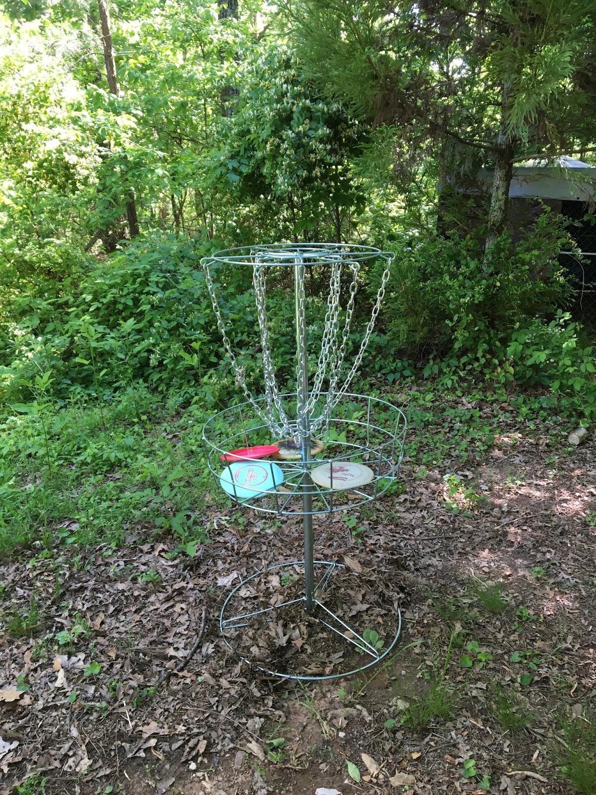 I enjoyed it, but college, a move to Planet Georgia, and doing other things caused me to lose touch with the sport. It was only after I went to see The Boy in Manitowoc that I started to reconnect. One of the parks has a disc golf course, and he had taken it up. We got me a disc (there was a shop near the park that sold a variety) and had a blast. By then, of course, the official goals (or holes) were now baskets with vertical chains, like in the pic here. Except, of course, actual courses have their goals sunk into the ground to prevent mischief.